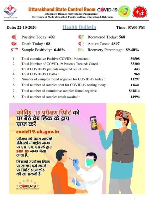 कोरोना उत्तराखंड : आज 402 नए मरीजो में देहरादून में 107