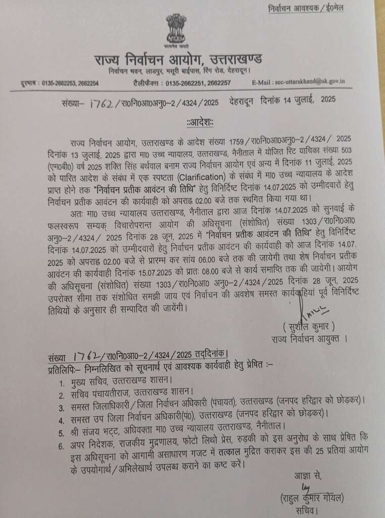 त्रिस्तरीय पंचायत चुनाव को लेकर जारी संशोधित अधिसूचना के अनुसार 14 जुलाई को पहले चरण में मतदान को लेकर चुनाव चिन्ह का आवंटन किया जाना था. लेकिन मामला नैनीताल हाईकोर्ट में होने की वजह से राज्य निर्वाचन आयोग ने 13 जुलाई को चुनाव चिन्ह आवंटन की प्रक्रिया को 14 जुलाई की दोपहर 2:00 तक के लिए रोक दिया था.